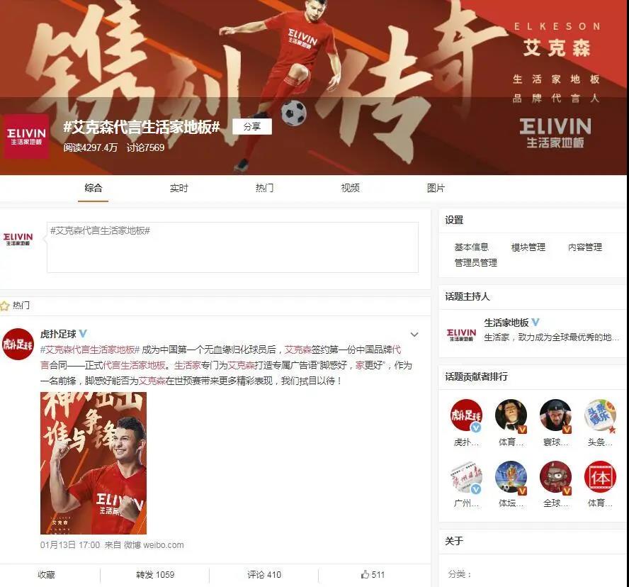 繼中國女足之后,2020年生活家攜手艾克森,再一次與體育結(jié)緣。“艾克森成為生活家地板代言人”、“給艾克森推薦年夜菜”雙話題成為今年生活家體育營銷話題的開端,艾克森作為中國足球歷史上首位非華裔歸化球員、中超多個賽季射手王,艾克森已經(jīng)代表國足出戰(zhàn)世預(yù)賽并打進(jìn)多個進(jìn)球,關(guān)注度和話題度齊飛。借助2020年春節(jié)的契機(jī),艾克森以中國人的身份度過首個中國年,生活家邀請全國各地的網(wǎng)友給艾克森推薦年夜菜,這一話題溫度與熱度并存,助推代言官宣,“艾克森代言生活家地板”話題閱讀量突破4000萬。