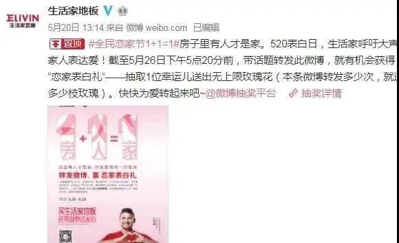 今年生活家地板借助520網(wǎng)絡(luò)情人節(jié)自帶流量的優(yōu)勢,在微博發(fā)起“全民戀家節(jié)1+1=1”的活動,聯(lián)合艾克森與王霜掀起一場“戀家表白禮”活動,進(jìn)一步深化合作內(nèi)涵。并借勢在微博掀起繼“轉(zhuǎn)發(fā)微博給中國女足發(fā)獎金”之后的又一波轉(zhuǎn)發(fā)熱潮——轉(zhuǎn)發(fā)微博抽取一位網(wǎng)友送出無限量玫瑰,向家人表達(dá)愛。