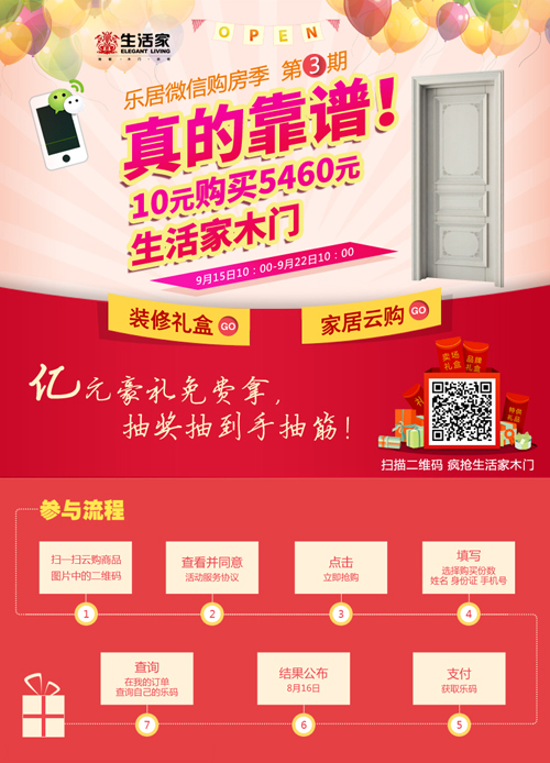 為了緊跟移動互聯的時代潮流,拉近與消費者之間的距離,生活家特攜手新浪樂居開展微信裝修節活動。9月15日(周一)上午10點, "10元搶生活家木門"微信云購正火熱進行中。