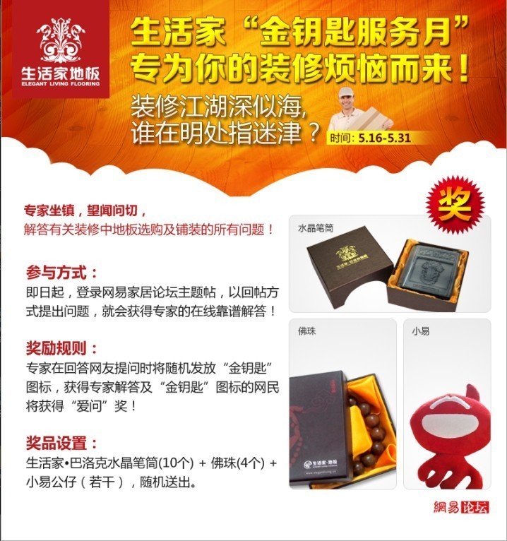 裝修江湖深似海,誰在明處指迷津?生活家地板金鑰匙服務月,專為你的裝修煩惱而來——即日起,登錄網易家居論壇,提出你的家庭裝修中的地板鋪裝煩惱問題,就會獲得生活家地板專家的在線靠譜解答,同時有精美禮品免費奉送。