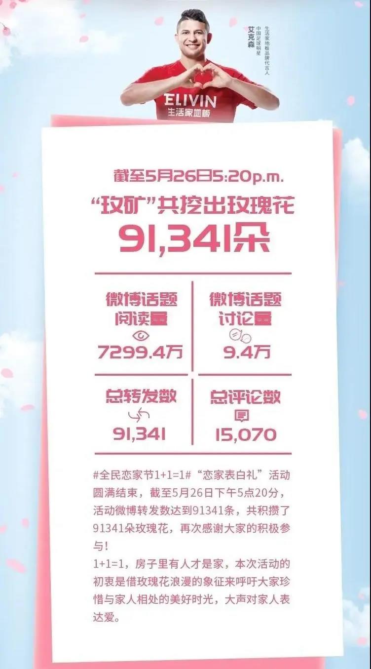 5月20日,生活家借助520網(wǎng)絡(luò)情人節(jié)自帶流量的優(yōu)勢,在微博發(fā)起“全民戀家節(jié)1+1=1”的活動,中國足球隊知名球星艾克森與王霜呼吁大家在向另一半表達(dá)愛的同時,不要忘記向家人表達(dá)愛意與感謝。生活家在官方微博掀起了一場“戀家表白禮”活動:轉(zhuǎn)發(fā)指定微博,就有機(jī)會獲得 “戀家表白禮”——抽取1位幸運兒送出玫瑰花,活動微博轉(zhuǎn)發(fā)多少次,就送多少枝玫瑰!在眾多大V和粉絲的轉(zhuǎn)發(fā)下,本次微博互動話題閱讀量高達(dá)7299.4萬,話題討論量達(dá)9.4萬,總轉(zhuǎn)發(fā)數(shù)91341。