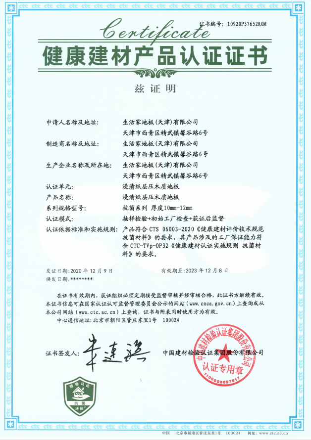 近日,生活家極地系列納米鹽抗菌地板,正式獲得CTC(中國建材檢驗認(rèn)證集團(tuán)股份有限公司)頒發(fā)的健康建材認(rèn)證證書,證書編號10920P37652ROM,發(fā)證日期為2020年12月9日。